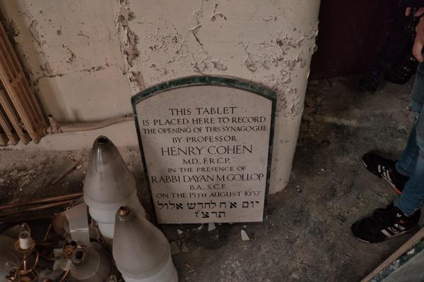 In May 1959, a fire was started by a burglar which destroyed the Torah ark and its scrolls and damaged part of the roof’s structure. At a cost of £50,000, the building was repaired and later re-consecrated in 1961. Another fire broke out in 1965, this time on the first two floors, but the damage was confined to the area.[2]